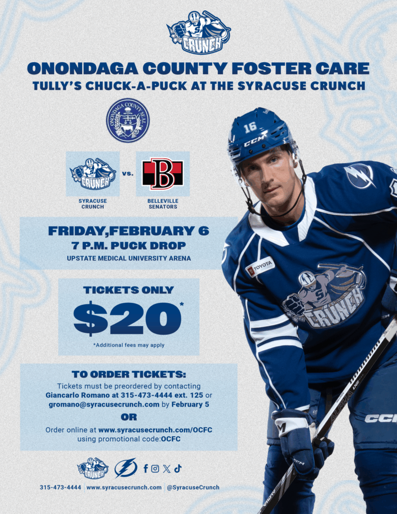 every year. The goal is to raise money for Onondaga County Foster Care. The game day is 2/6/2026, you need to pre-order tickets as they are required. The money goes to benefit Onondaga County Foster Care and the Kinship Parents/Kiddos!!!! Please see the below link on how to order! And thanks for all you do for the children in need